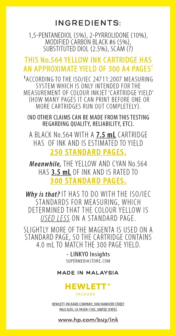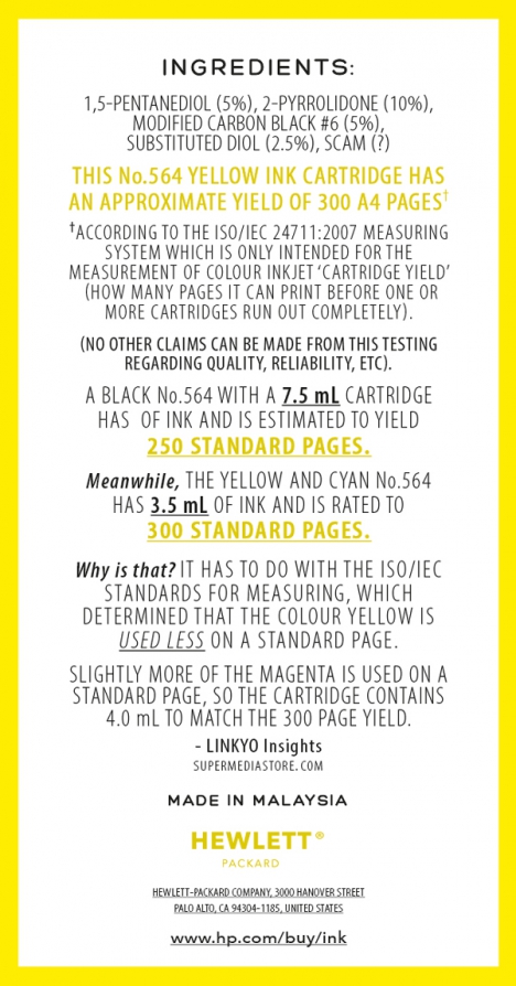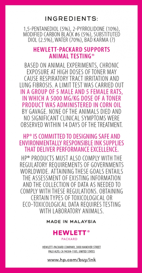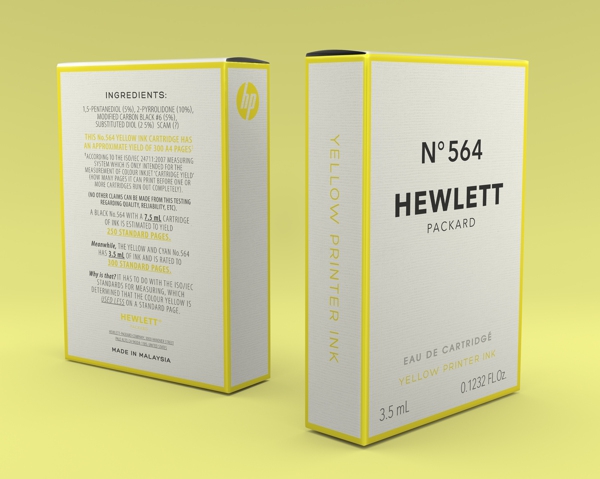 Простой шрифт на белом фоне повторяет стиль Chanel, однако вместо названия духов значится «Hewlett Packard №564». На обороте можно прочитать подробную информацию о продукте.