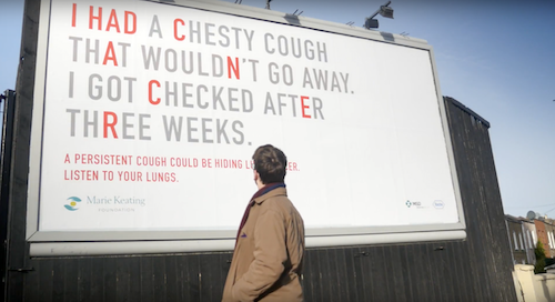 Чтобы привлечь внимание прохожих к раку лёгких ирландское агентство DDFH&B совместно с благотворительной организацией Marie Keating Foundation установили кашляющий билборд. В тексте выделены некоторые буквы, с помощью которых зашифровано важнейшее сообщение: «I had cancer» («У меня рак»).