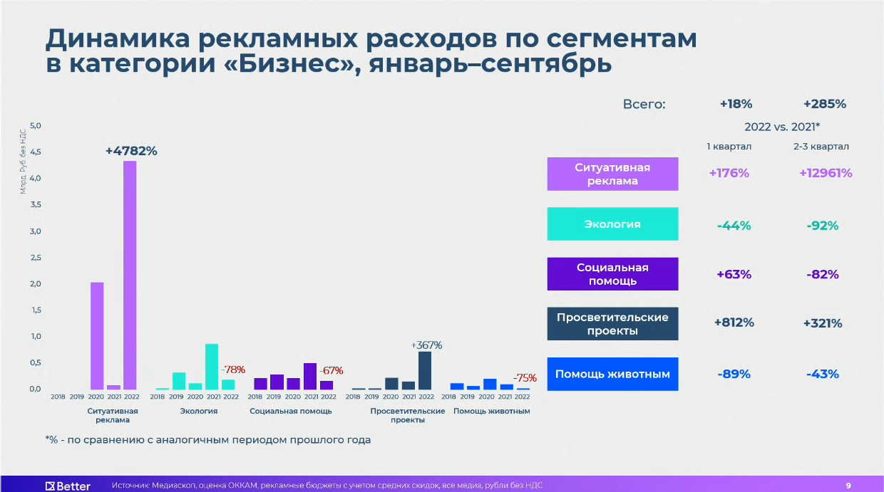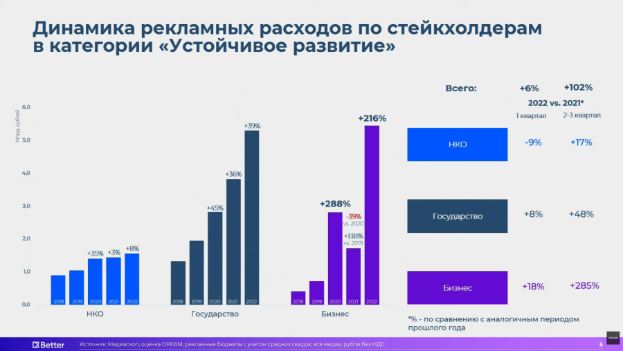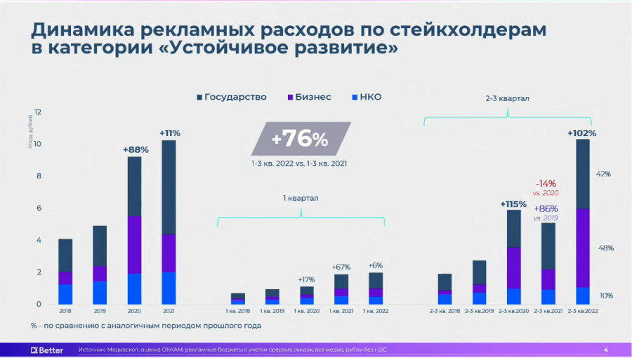 Несмотря на общее снижение рекламной активности в 2022 году, категория «Устойчивое развитие» показала рост на 76% по сравнению с прошлым годом. В основном за счёт большого количества антикризисной коммуникации, направленной на поддержку потребителя. При этом доля рекламных затрат растет: с 3% в 2021-ом до 7% в 2022-ом от всего рекламного рынка. А во втором-третьем кварталах рост составил 9%, рассказывает генеральный директор Better (входит в ОККАМ) Владлен Заморский на конференции Sustainability 22/22.