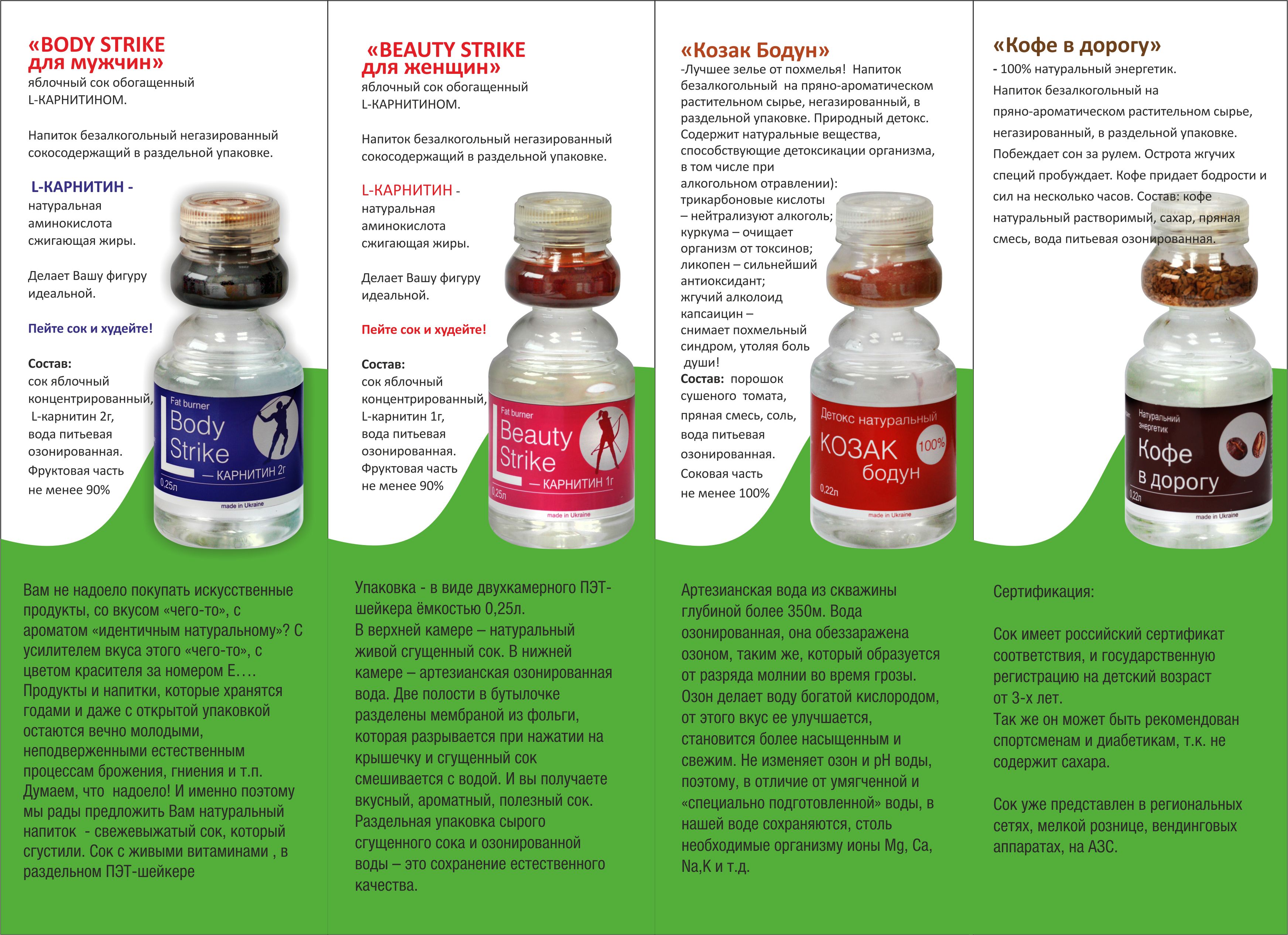 Дистрибутор напитков в России - ООО «Народные соки» - ищет партнеров для реализации на территории страны линейки напитков в раздельной упаковке, в которую входят сокосодержащие напитки, энергетическиq напиток "Кофе в дорогу", спортивные напитки Body Strike и Beauty Strike и антипохмельный напиток «Козак Бодун». Сокосодержащие продукты линейки объединены под маркой "Зеленая сова". Однако эксперты сильно сомневаются в перспективности и целостности как бренда, так и всей продуктовой линейки.