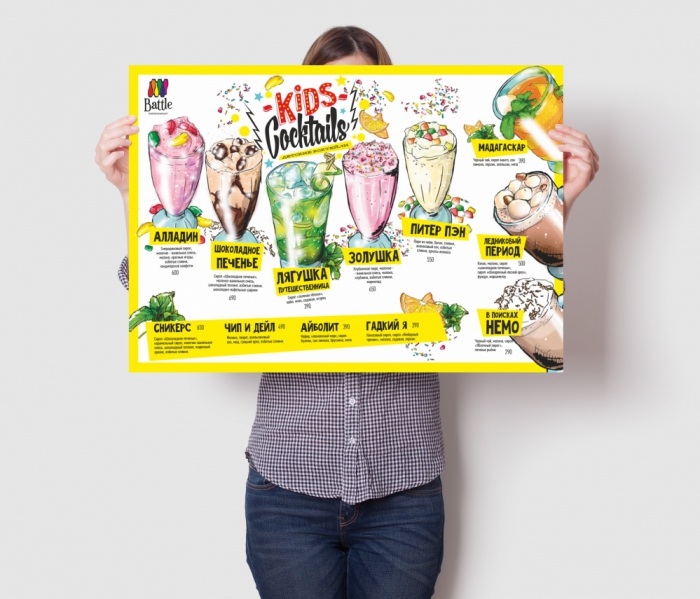 Для ресторана был разработан фирменный стиль, основное меню и коктейльная карта. Для боулинга было разработано оригинальное детское меню и сопутствующие карта бара, коктейльная карта и основное меню заведения.