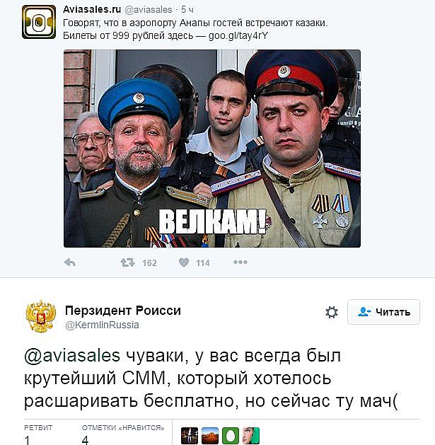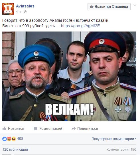 Сервис для поиска авиабилетов Aviasales снова проявил себя мастером актуального SMM. В аккаунтах компании появилось сообщение «Говорят, что в аэропорту Анапы гостей встречают казаки. Билеты от 999 рублей здесь», которое внесло смятение в ряды пользователей. Публикация появилась через несколько часов после нападения на сотрудников Фонда борьбы с коррупцией (ФБК).