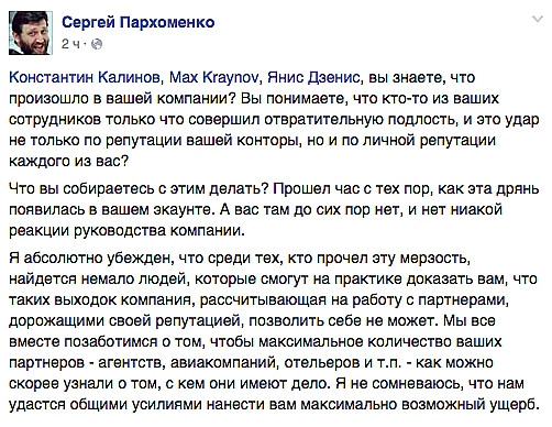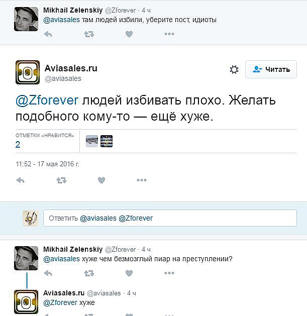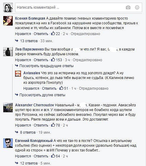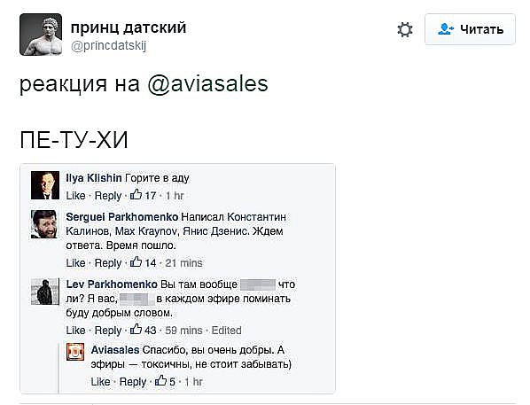 Часть подписчиков уже обвинила Aviasales в поддержке людей, совершивших уголовное преступление. В комментариях они оставляют угрозы и оскорбления. Ведущий «Эха Москвы» Сергей Пархоменко поспешил обратиться к партнёрам интернет-проекта