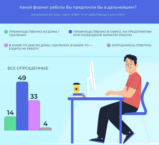 Несмотря на всероссийские и региональные ограничительные меры в 2020−2021 годах, количество переведенных на удалёнку сотрудников осталось достаточно небольшим. Опыт удалённой работы имеет каждый четвертый работающий россиянин (25%). Процент работников, оставленных на удалённой работе, за год сократился с 11% до 10%. Заметнее уменьшилось число тех, кто трудится в гибридном формате (ездит в офис несколько раз в неделю, а в остальные дни работает из дома), — с 12 до 9%.