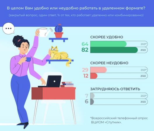 Россияне научились ценить плюсы удалёнки. В 2021 году на вопрос, удобно ли работать из дома, утвердительно отвечали 64%. А сейчас так считают 82% опрошенных. О том, что в удалёнке больше плюсов, граждане стали говорить в 2,5 раза чаще, чем в пандемийные времена.