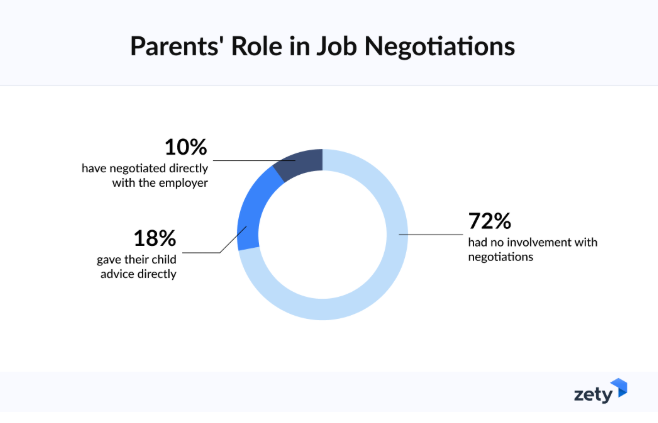 Участие родителей нередко распространяется и на этап собеседования: 20% респондентов рассказали, что их родители присутствовали при интервью (15% лично, 5% онлайн). Еще 28% сообщили, что родители помогали им вести переговоры о зарплате — из них 18% просто советовали, а 10% родителей вели переговоры напрямую.
