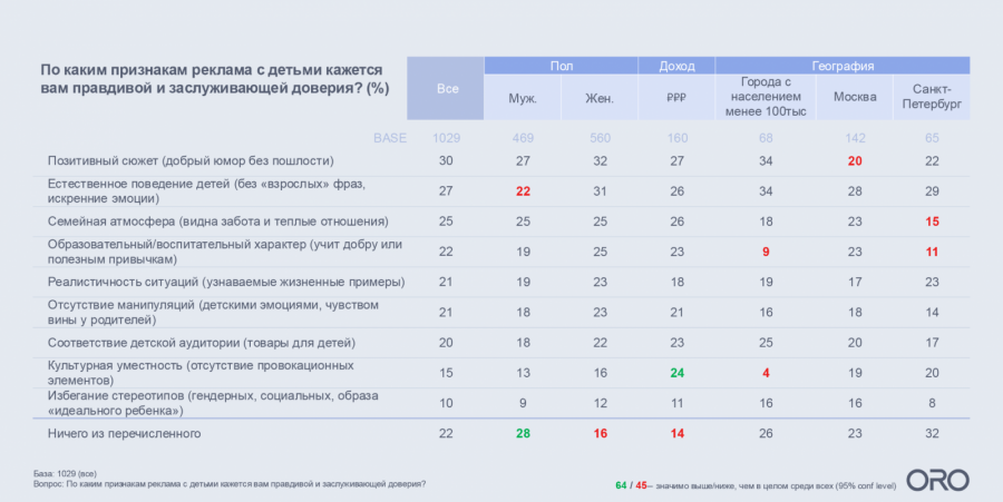 Реклама с детьми кажется интервьюируемым правдивой и заслуживающей доверия, когда в ней есть позитивный сюжет (это отметили 30% опрошенных), естественное поведение детей (27%) и семейная атмосфера (25%).