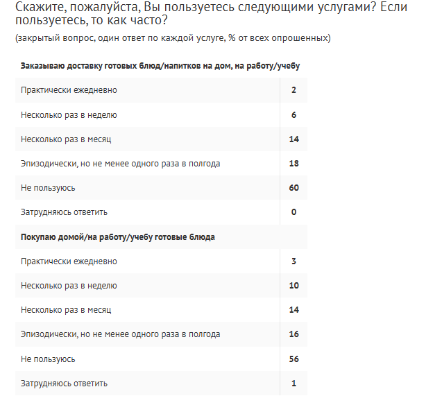 Готовая еда остается одним из главных драйверов в сегменте товаров повседневного спроса. Каждый второй россиянин время от времени заказывает готовую еду или покупает ее офлайн, но пока это происходит эпизодически, следует из результатов опроса Аналитического центра ВЦИОМ.