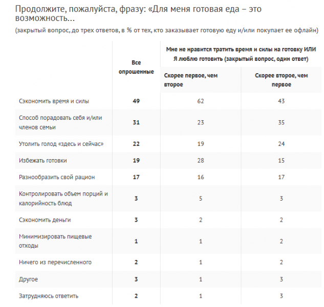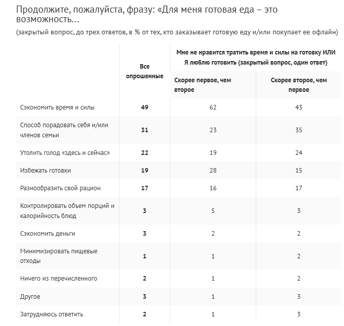 Главный драйвер спроса — экономия времени и сил. На втором месте — желание побаловать себя и близких, и этот мотив обгоняет по популярности прагматичное «утолить голод здесь и сейчас». Реже готовую еду воспринимают как способ избавиться от кухонной рутины или получить новый гастрономический опыт.