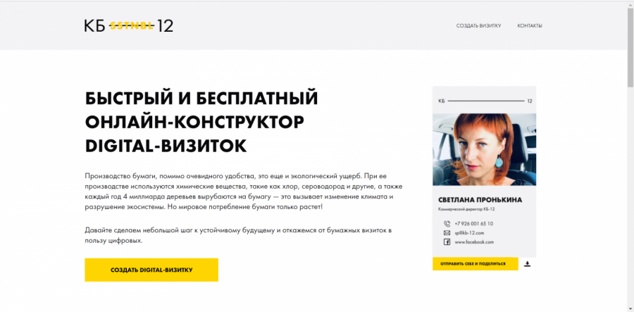 КБ-12 полностью переходит на использование цифровых визиток, и отдел социально ориентированного маркетинга к международному дню без бумаги сделал доступный для всех быстрый инструмент для создания digital-визиток с QR-кодом — Sustainable card.