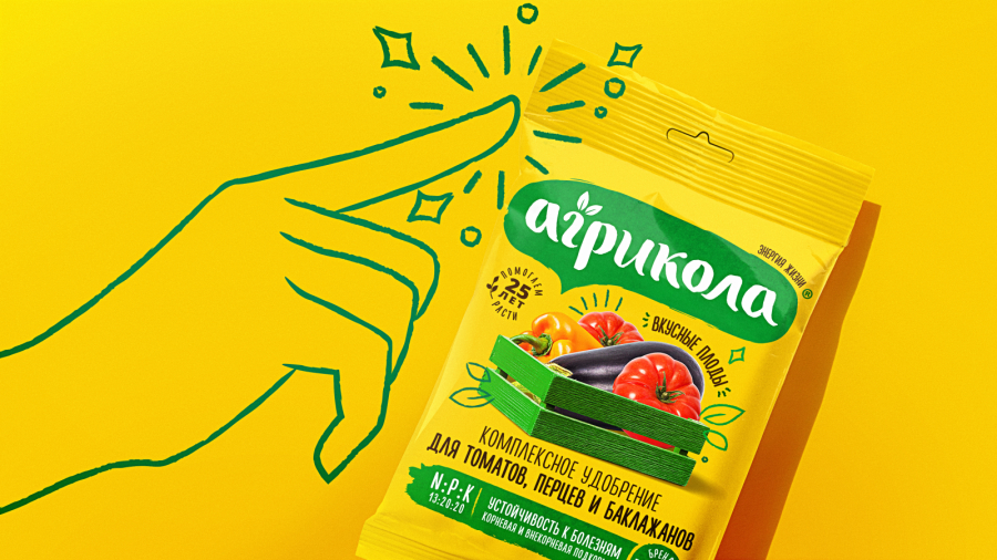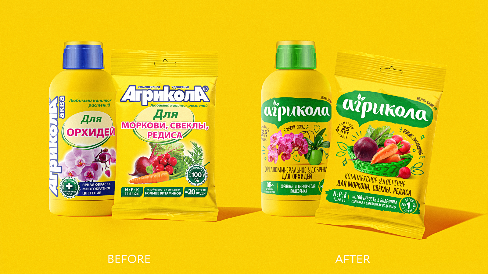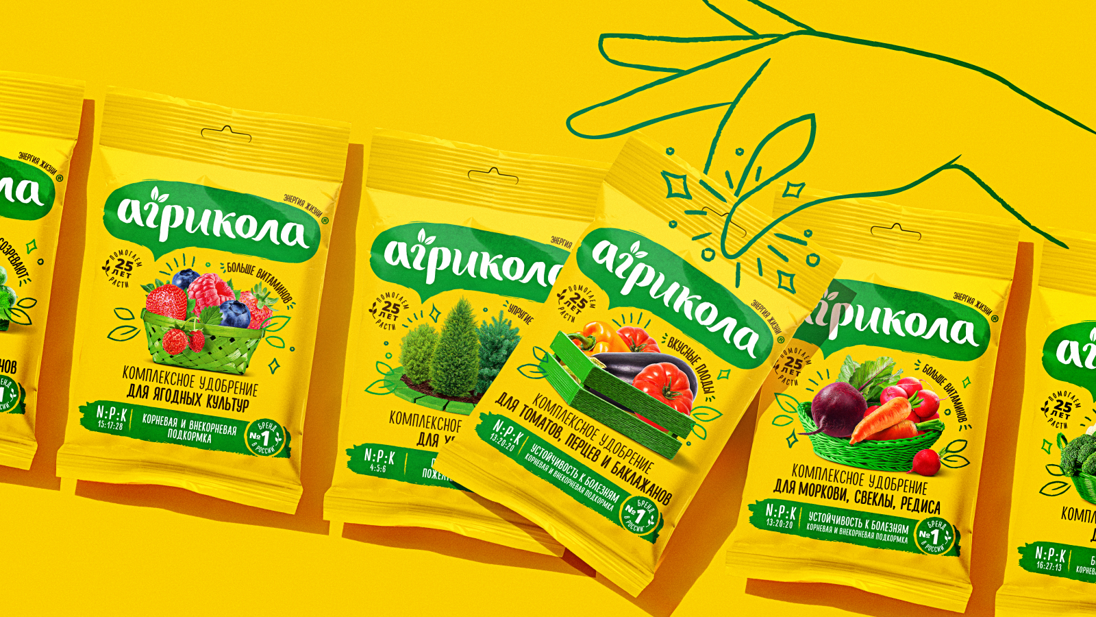 Посвятив десятилетия исследованиям растений и заботе о них, «Агрикола» научилась чувствовать природную силу. Логика и знания дополняются интуицией, опытом и навыком понимания растений. Это отражает солнечный и теплый стиль упаковки. Единая четкая архитектура адаптируется под многочисленные форматы продуктов, а важная функциональная информация и эмоциональные клеймы расположены максимально удобно для чтения.