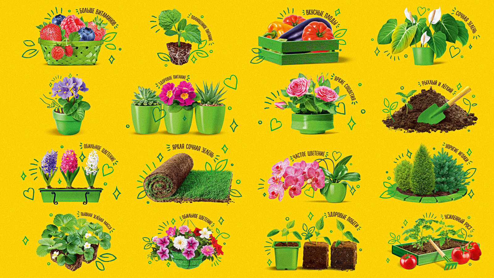 «Агрикола» — удобрения и грунты для плодовых, цветочных, ягодных и овощных культур для применения в личных подсобных хозяйствах. Бренд давно не обновлял свой фирменный стиль, а главное преимущество на полке — цвет — стало заимствоваться конкурентами. Клиенту нужно было смысловое и визуальное обновление. Команда