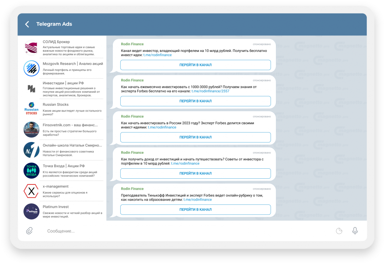Magnetto.pro обратился Rodin Finance (Алексей Родин), специалист по разработке и сопровождению семейной финансовой стратегии. К моменту обращения в агентство него был свой сайт и Telegram-канал с определенным количеством подписчиков. Команда Magnetto.pro рассказала Sostav, как с помощью Telegram Ads удалось привлечь 1 162 подписчика за 21 день.
