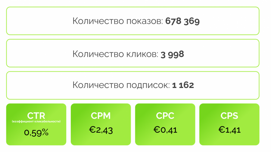 С учетом небольшого рекламного бюджета — €1650, нам удалось получить следующие цифры по первой задаче (привлечение подписчиков):