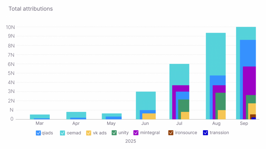 Как мы и ожидали, OEMAD стал бустом для установок и регистраций. А Qi Ads справился с увеличением доли столиц. В отличие от других in-app источников, точность попадания в таргетинг составила более 60% по сверке с CRM клиента. На примере Unity, с настроенным таргетингом на столицы (Москва с областью, Петербург с областью, Сочи), показатель не превышал 30%.
