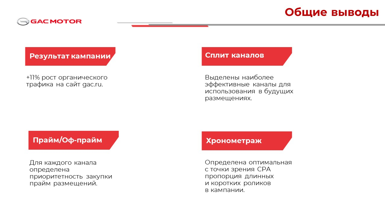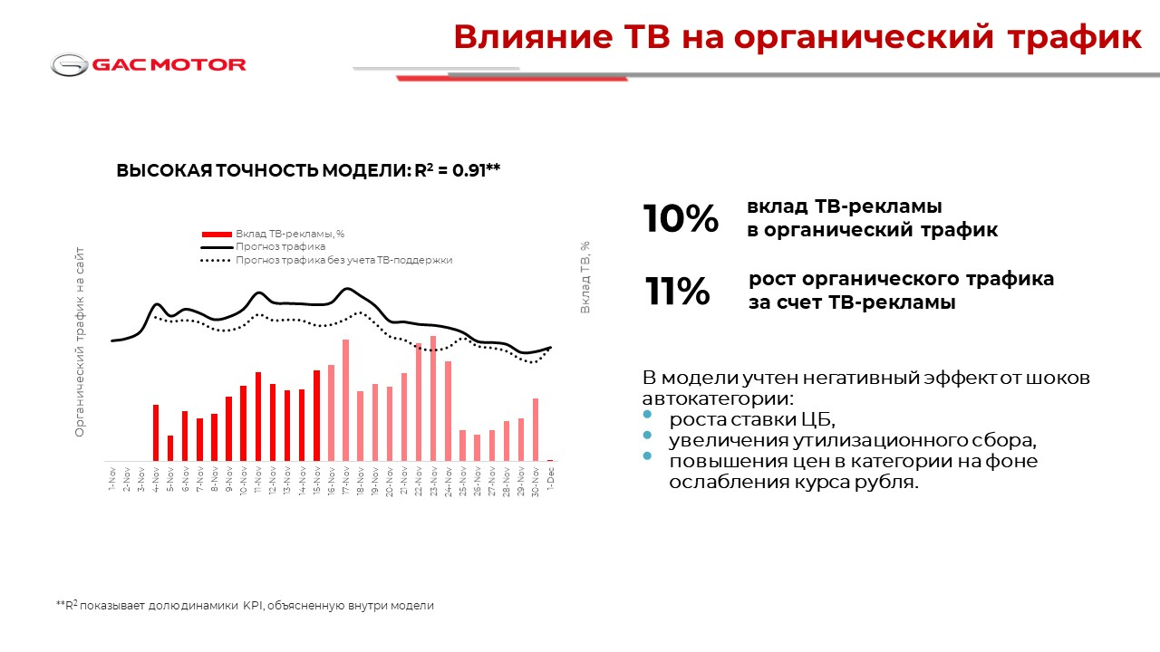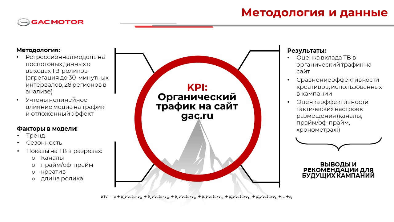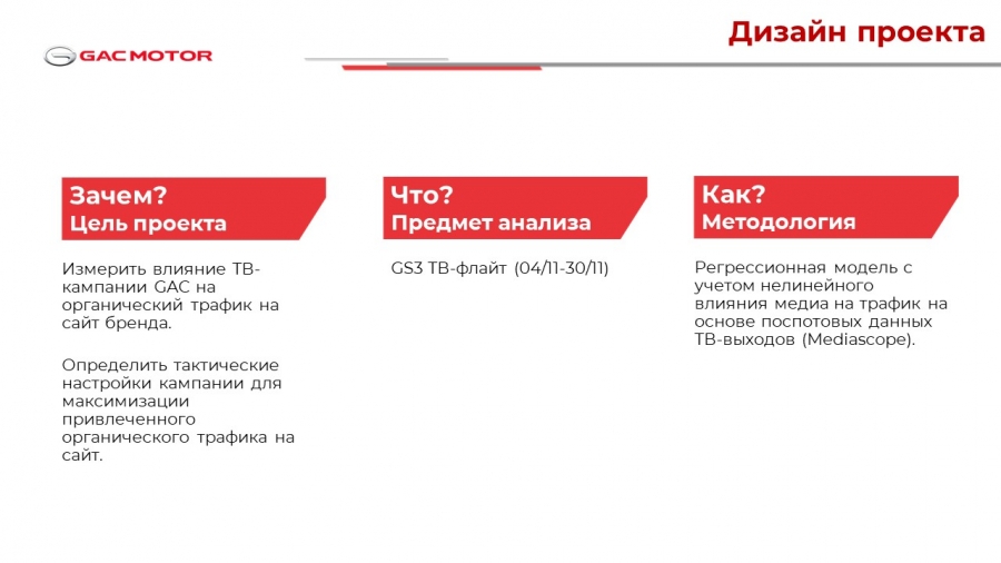 Одна из задач — определить, как ТВ-кампания повлияла на органический трафик сайта GAC MOTOR RUS и какие тактические решения в размещении рекламы приводят к его росту.