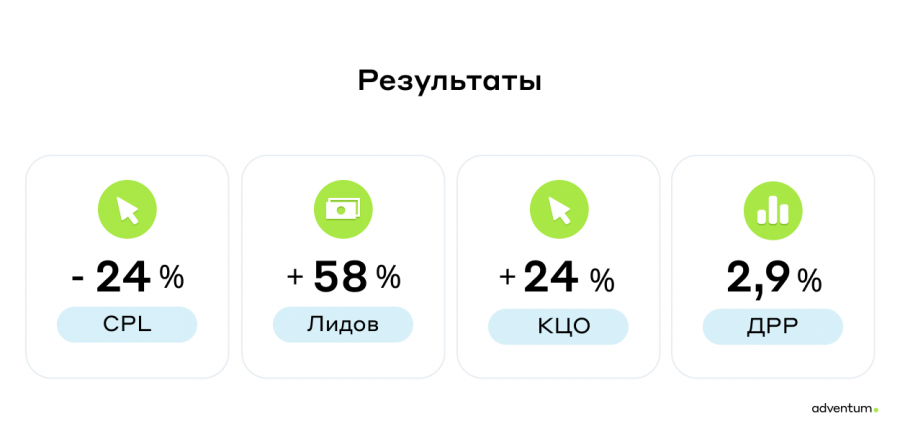 В результате кликабельность (CTR) выросла в два раза, а также снизился показатель CPA по целевым лидам.