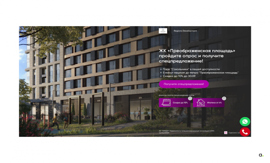 В этом сегменте бизнеса обычно используется три вида посадочных: это квиз, лид-форма и сайт. Мы попробовали все варианты, чтобы выбрать наиболее рабочую форму именно для ЖК «Преображенская площадь».