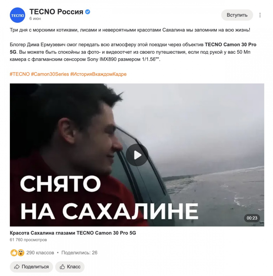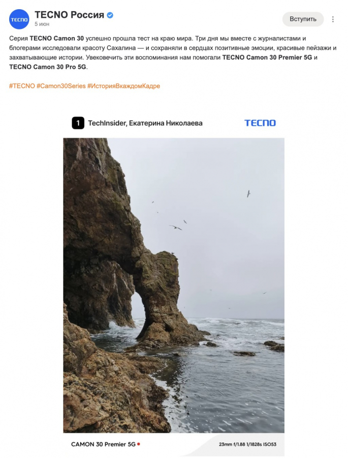 Самыми эффективными по показателям вовлеченности оказались три поста TECNO: две публикации про съемки природы Сахалина и одна о технологиях камер смартфонов бренда.