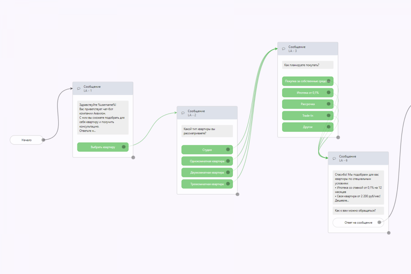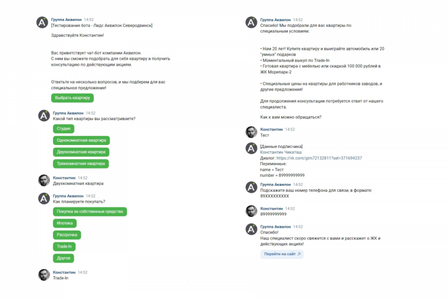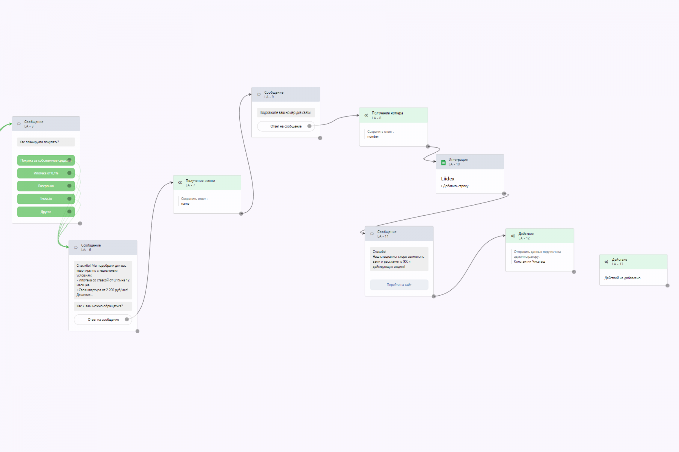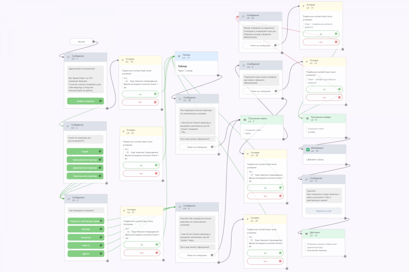 С улучшенным функционалом бот способен сразу проверять номер на соответствие российскому формату и уведомлять пользователя об ошибке до тех пор, пока он не введёт цифры правильно. Только после этого телефон сохранится в базе CRM и Calltouch. Затем уже менеджер со стороны девелопера сможет связаться с потенциальным клиентом, предложив ему наиболее выгодный формат сделки. Также бот способен удерживать внимание пользователя и не давать ему забыть о выгодных предложениях застройщика. Если пользователь остановится на любом этапе, то через 24 часа получит от бота подборку квартир. То есть бот способен перескочить этап ответов на вопросы и сразу спросить у пользователя контактные данные для связи.