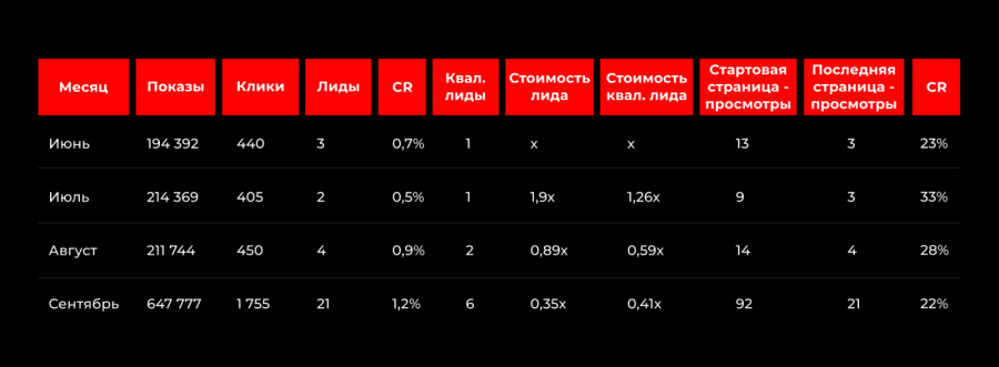 Таблица демонстрирует результаты по стоимости лидов и их количеству с начала работы чат-ботов. За месяц работы агентство получило лиды в два раза дешевле, сделав охватный бюджет ликвиднее лидогенерационного. Обе гипотезы подтвердились и смогли увеличить эффективность работы чат-бота.
