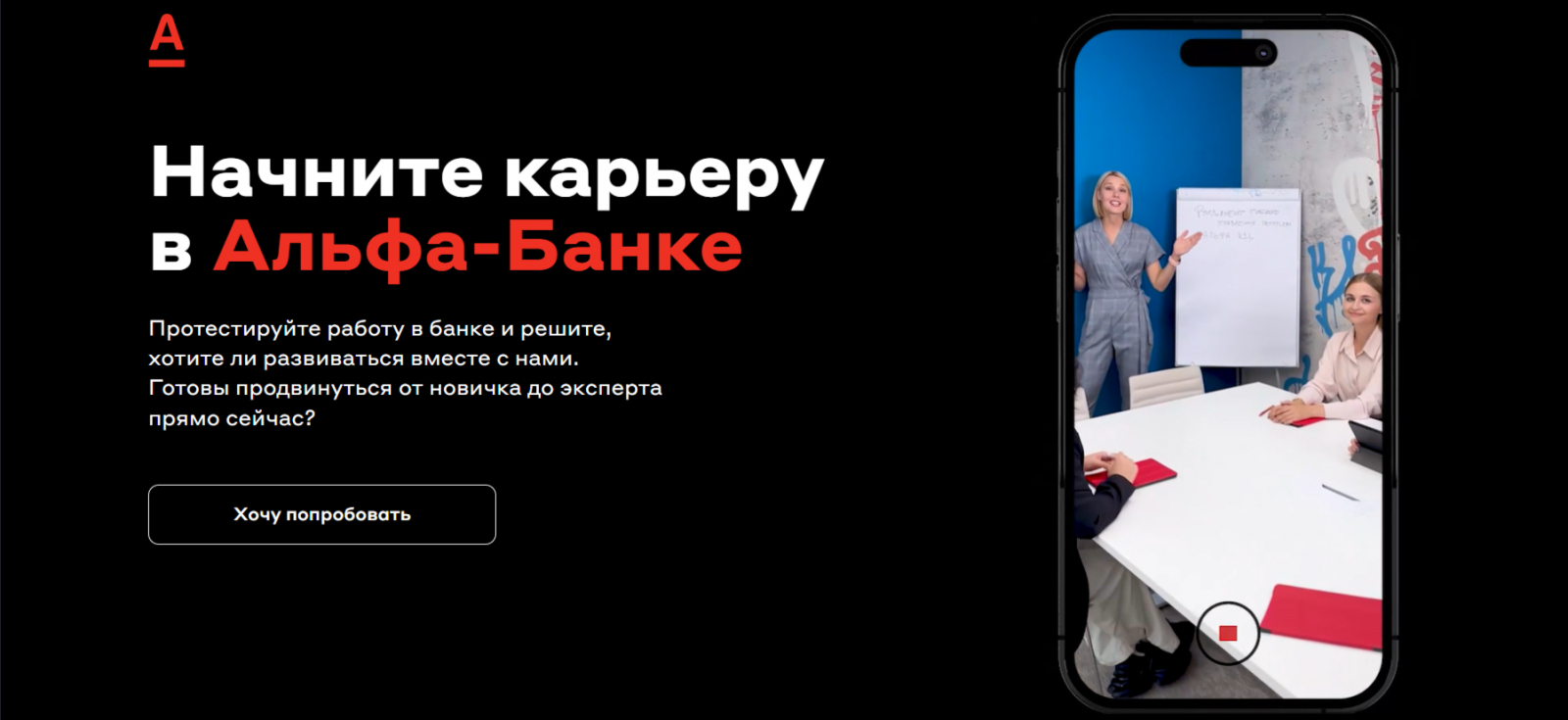 Проект «АльфаСимуляция» возвращается — формат очень зашёл нашим кандидатам в прошлом году. Мы сохранили и апгрейдили его. Это как любимое приложение в смартфоне: нужно просто обновить и всё заработает ещё лучше. Вы снова погружаетесь в увлекательный скринлайф и проживаете день в банке за героя, которого выберете сами. В «АльфаСимуляции 2.0» не будет скучно, даже если вы проходили первую часть. Пользователь сможет построить два новых карьерных трека и оценить, насколько вам близка культура умных и свободных в банке.