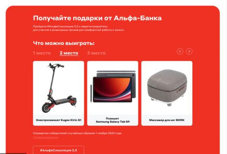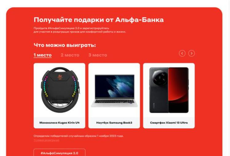 Продумали для участников симуляции и бонусы. Каждый, кто доходил в игре до конца, мог зарегистрироваться в розыгрыше призов. Да, видеоинтерактив полезен сам по себе, так как даёт возможность посмотреть вглубь компании, но шанс выиграть функциональные и современные гаджеты от «Альфа-банка» привлёк к нему ещё больше внимания.