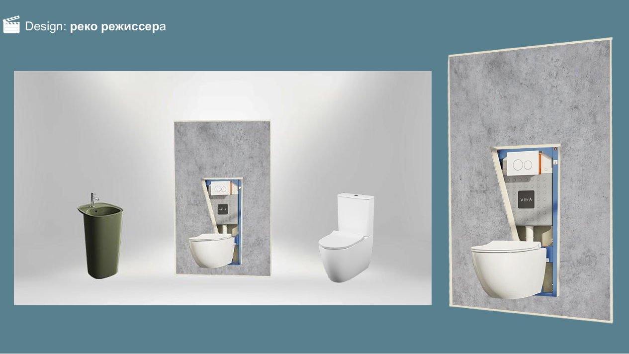 Так как бюджет был ограничен, мы решили сделать минималистичную стилистику съемок на белой циклораме. Единственной декорацией стали сами объекты клиента — сантехника VitrA (унитазы, раковина со смесителем). Это позволило нам избежать сложной и дорогостоящей застройки и сфокусировать зрителя на самом главном.