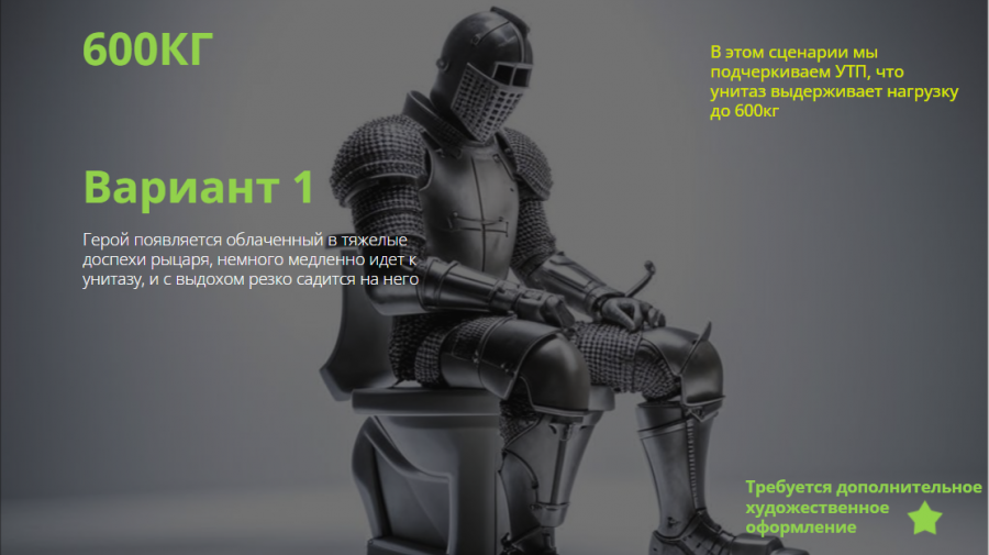 - Рыцарь проверяет инсталляцию Mia Round на прочность: он в тяжелых латах садится на унитаз. Так мы показали, что инсталляция выдерживает вес до 400 кг.
