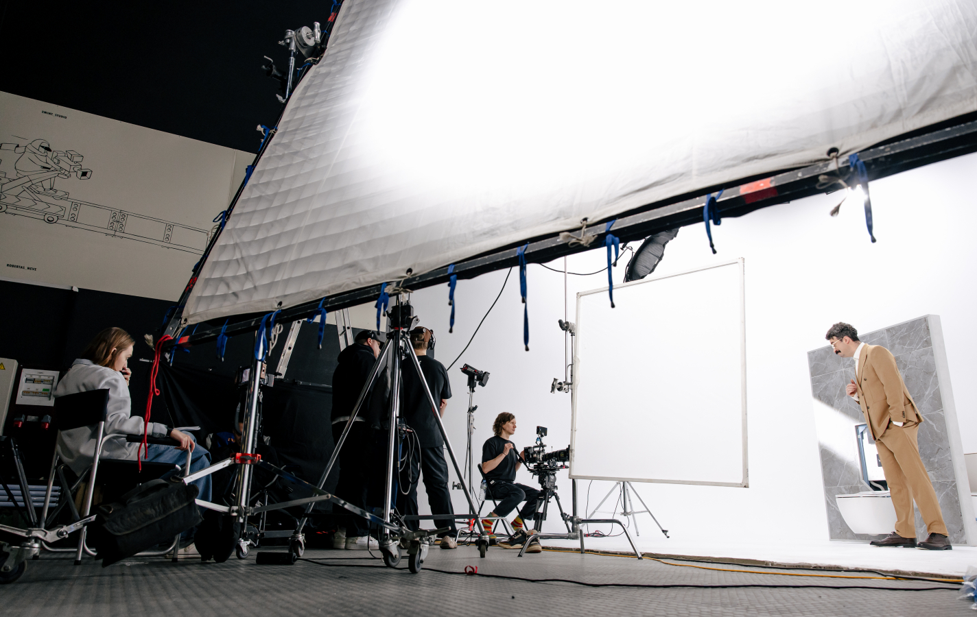 На съемочной площадке нам нужно было решить несколько интересных задач. Например, как подвести воду к раковине прямо внутри студии? Художники-постановщики заранее сделали специальную беспроводную систему подачи воды прямо к раковине Arkitekt. Также возникла проблема с отражениями: сантехника была выполнена из сильно отражающих материалов (например, кнопки смыва), поэтому пришлось оперативно переставлять световые приборы и использовать специальные сетки для избежания отражений камеры и команды в кадре.