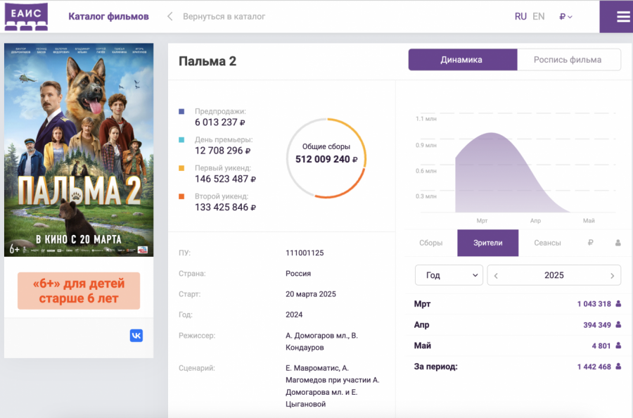 Фильм «Пальма 2» производства кинокомпаний «Марс Медиа», «Амедиа Продакшн», телеканала «Россия» и онлайн-кинотеатра Okko посмотрели в кинотеатрах страны уже более 1,4 млн зрителей. Для нашей команды особая гордость, что этот семейный блокбастер обрел социальную миссию. Наша коллаборация с «Авито» привлекла внимание индустрии, но главное — она смогла помочь четвероногим обрести новый дом и заботливых хозяев. Чему мы, безусловно, очень рады.