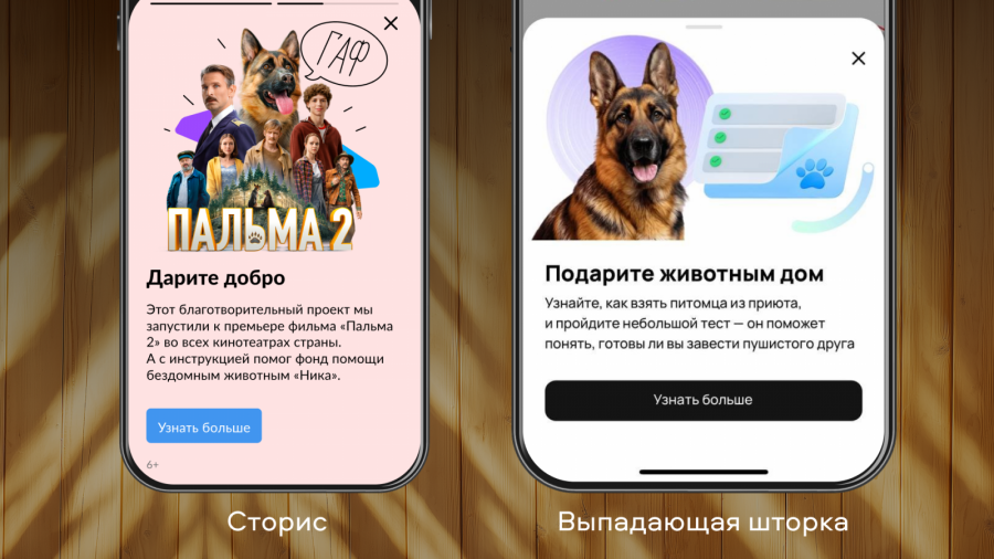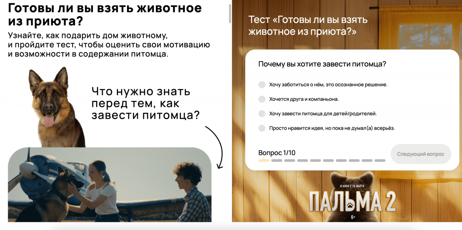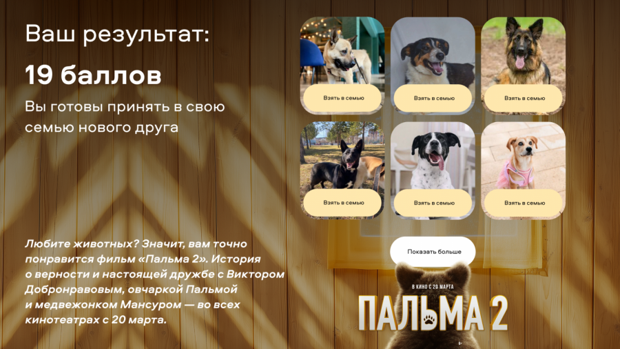 В конце января 2025 года кинокомпания «Централ Партнершип» обратилась к нам с идеей запуска благотворительной акции к премьере фильма «Пальма 2», рассказывающего о дружбе между человеком и животными. Изначально предполагалось создание лендинга, где пользователи могли бы пройти тест на определение, какой питомец им нужен, выбрать животное из подборки объявлений на «Авито» и далее прислать фото счастливого четвероного друга в семье, получив поощрение в виде промокодов в кино.