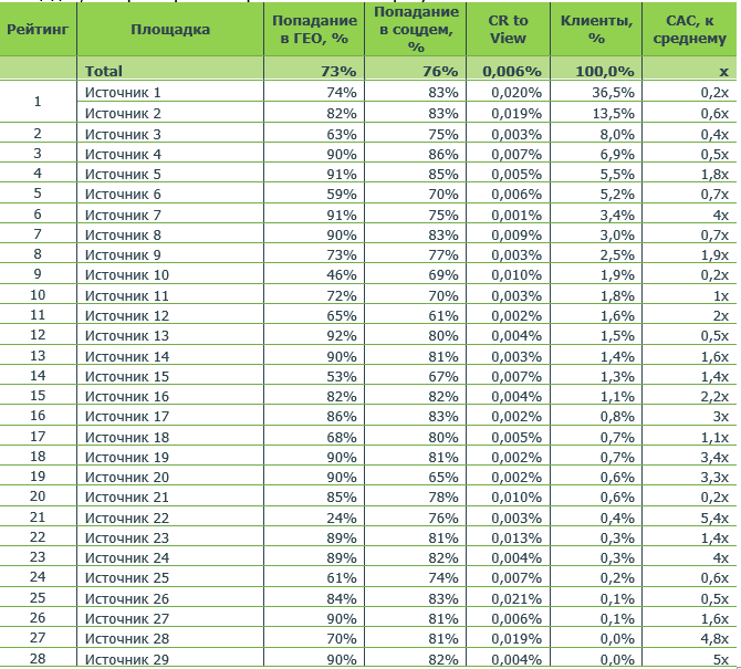Для оценки конверсии вывели метрику CR-to-view, которая оценивает конверсию из показов в клиентов по каждому источнику показа рекламы.