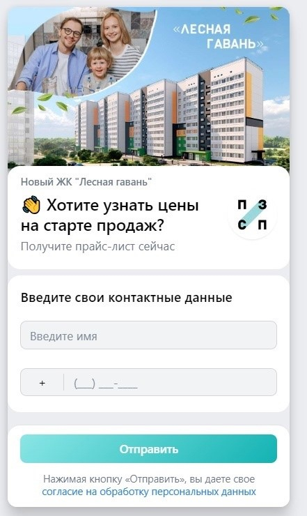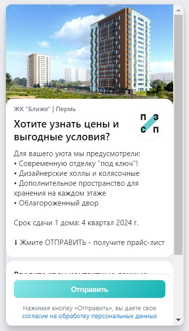 На первом этапе команда агентства создала лид-формы в рекламном кабинете: оформила их в соответствии с брендбуком девелопера и добавила описание. Решили протестировать два варианта: с коротким описанием квартир и с подробным.