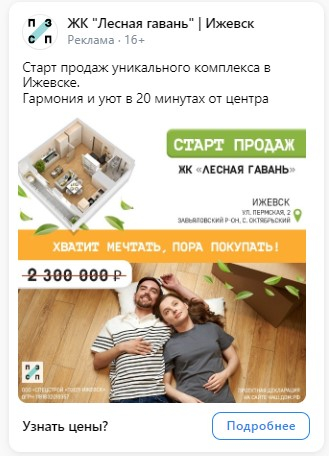 Основной акцент в креативах делали на акциях и преимуществах новых жилых комплексов, а также на этапах готовности новостроек, чтобы сформировать доверие потенциальных покупателей к бренду. Формат универсальных объявлений автоматически адаптировал загруженные в кабинет изображения под доступные места и площадки для показа. Наилучший результат показывали статичные и видеокреативы в соотношении 1:1.