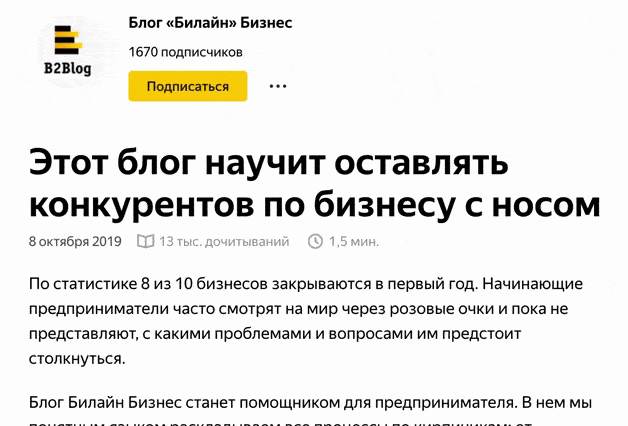 - Старайтесь соблюдать стилистический баланс: подробно, экспертно, но при этом просто и понятно. В этой стилистике и написаны статьи для блога «Билайн Бизнес» и именно она лучше всего сработала в «Яндекс.Дзене».