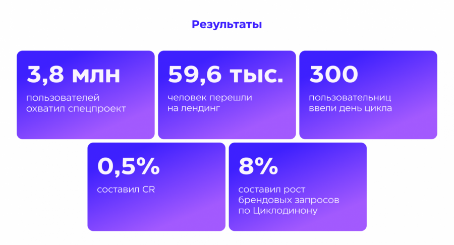 Медийный формат должен был сформировать первичный интерес к теме, контекстная реклама — привести пользователя к целевому действию (ввести свой день цикла), а блогеры — нативно рассказать про проект. Такой подход позволял работать одновременно с охватом, вовлечением и конверсией.