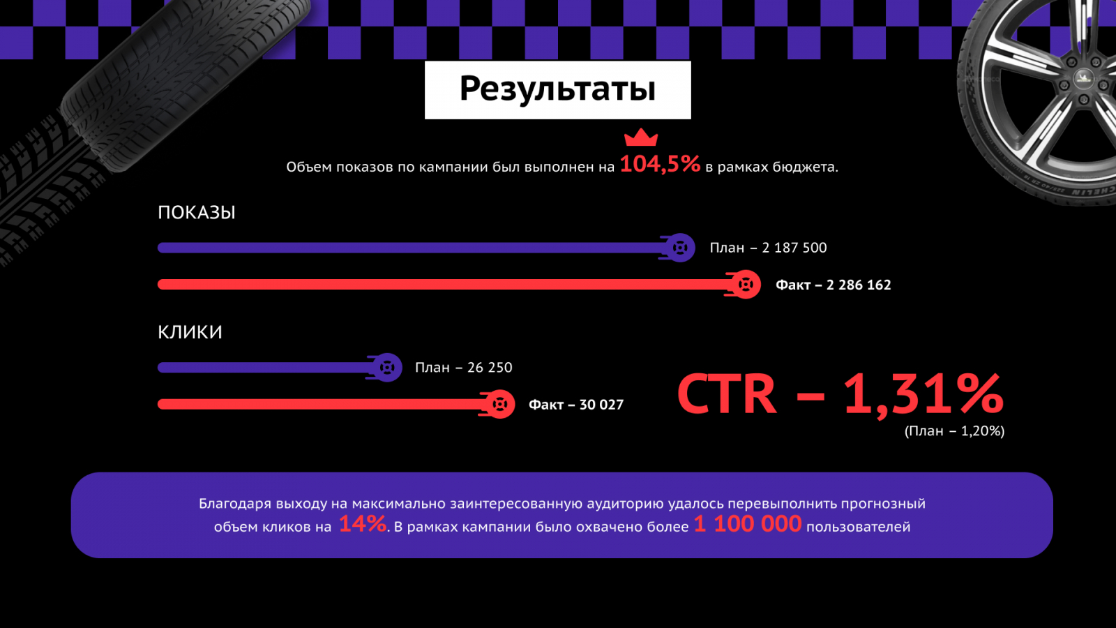 Платформа охватила более 1 млн уникальных пользователей, достигнув среднего CTR в 1,31%. Кроме того, план по показам и кликам был перевыполнен: благодаря выходу на максимально заинтересованную аудиторию объем кликов превысил бенчмарк на 14%, а объем показов превысил плановые показатели на 4,5%.