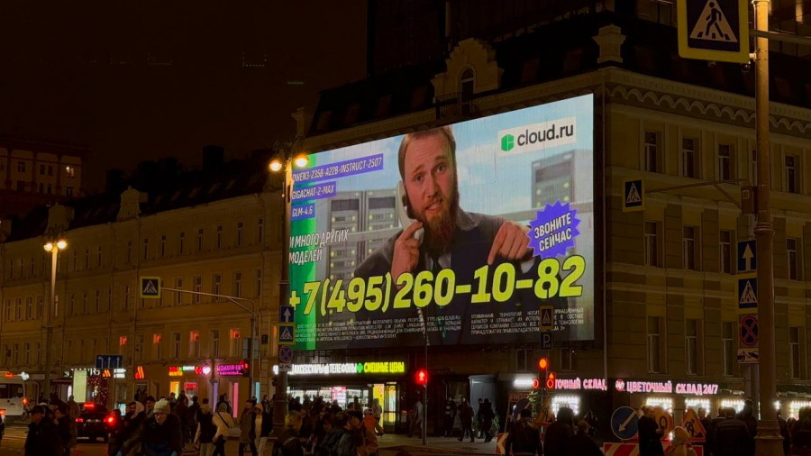 - Наружная реклама у метро «Белорусская». Медиафасад стал тизером всей рекламной кампании. Креатив в стиле нулевых продвигал современные LLM-модели — ироничный контраст вызвал обсуждения в московских и IT-каналах Telegram.