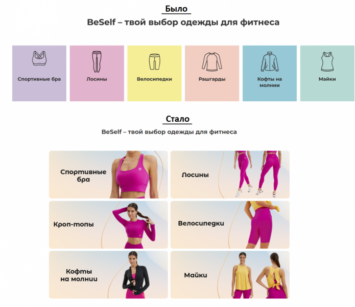 Ещё одним существенным изменением стала переработка блока с категориями. Первоначально он не сильно выделялся на странице и не помогал визуализировать продукцию. Дизайнеры предложили сделать этот блок частью рекламы одежды, добавив в него фотографии товаров.