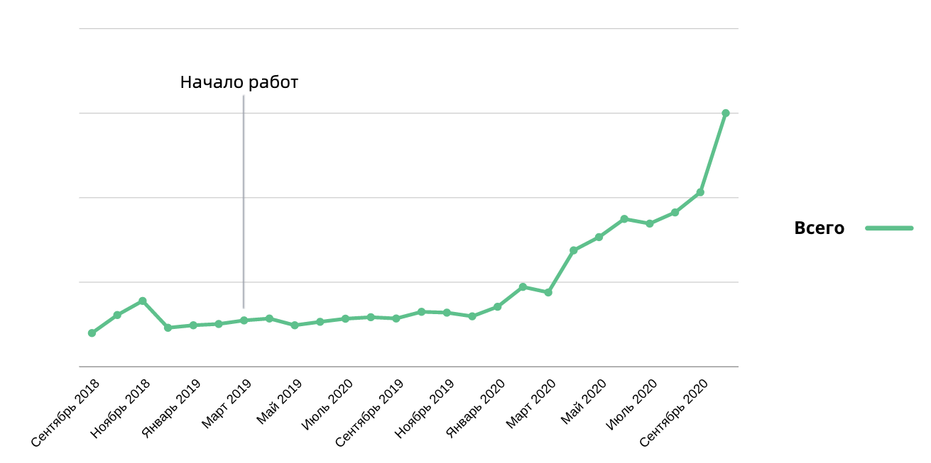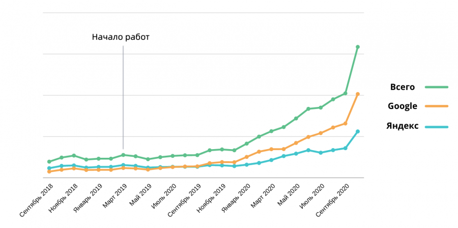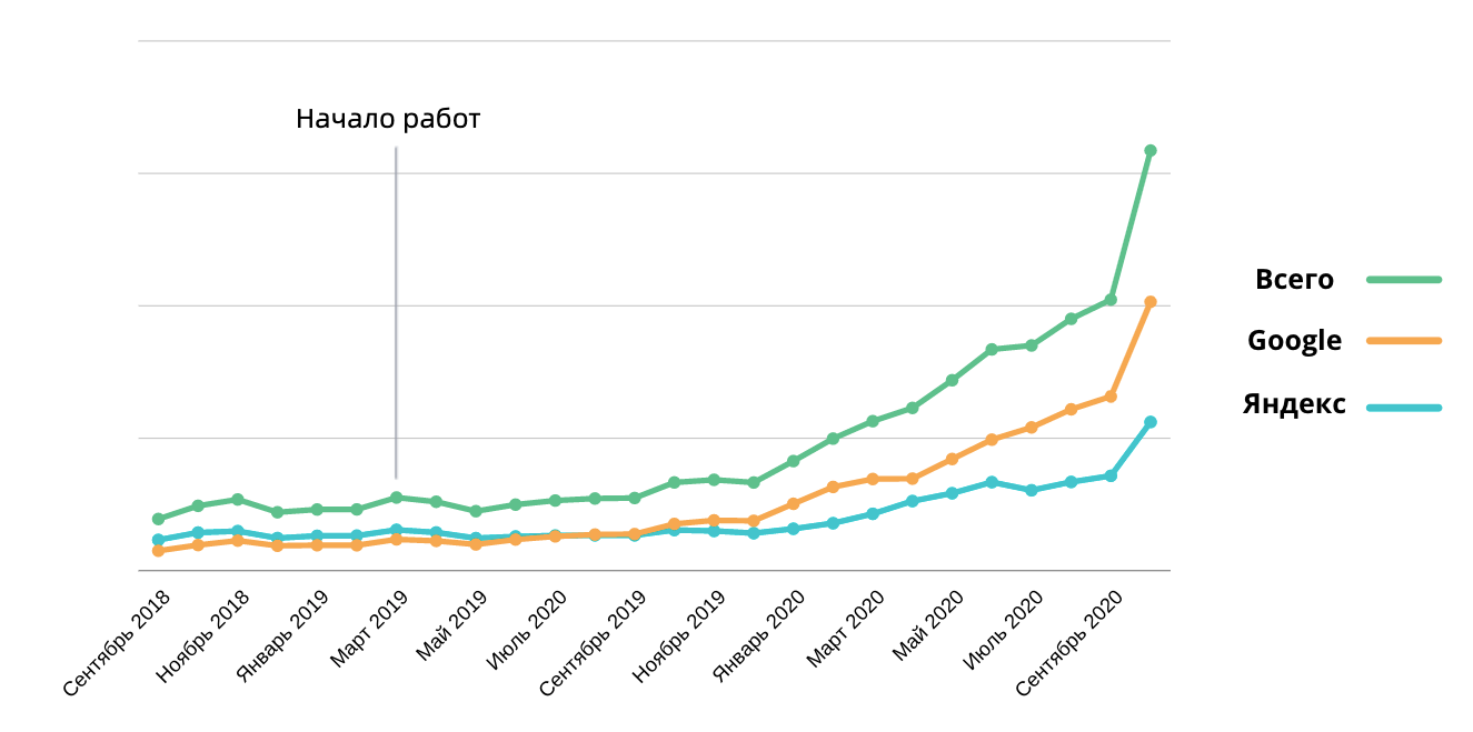 Мы и ранее проводили наращивание трафика для медицинских компаний, поэтому еще на этапе первичного аудита сделали гео-оптимизацию стратегическим инструментом. Это практически безальтернативный способ продвижения для организаций, которые имеют представительства во многих городах России. Первые результаты появляются очень быстро, однако и после этого важно продолжать следить за динамикой роста трафика, точечно прорабатывать отдельные категории сайта для увеличения не только количественных, но и качественных показателей.