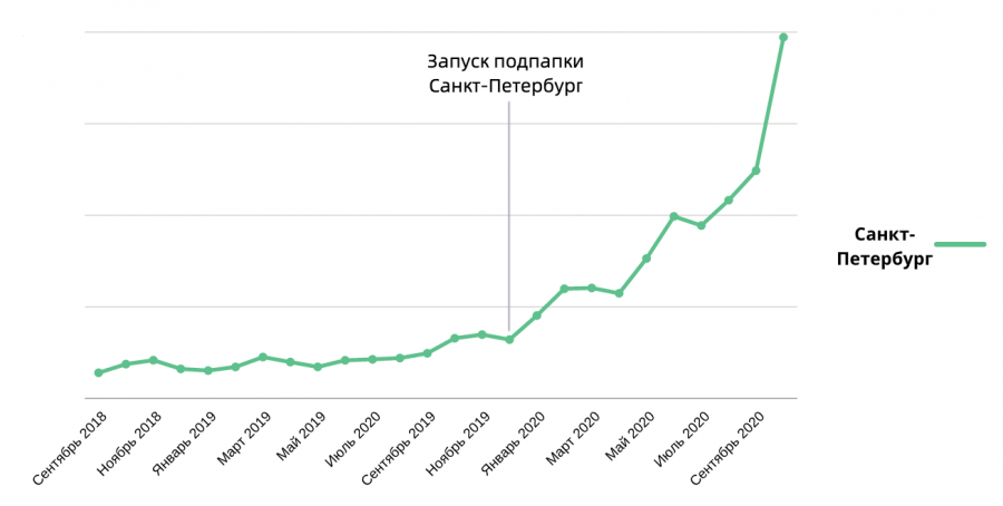 Для начала был сделан пробный вариант оптимизации, чтобы показать клиенту эффективность такой стратегии. Наша команда выбрала четыре города с большим потенциалом в наращивании трафика: Санкт-Петербург, Екатеринбург, Новосибирск, Нижний Новгород. Через два месяца мы зафиксировали значительный рост трафика, после чего «Гемотест» решил ввести подпапки для всех городов.