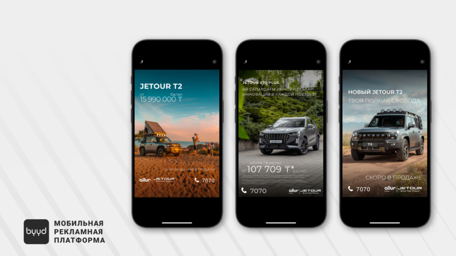 Для креативов использовались Rich Media баннеры, которые показывали преимущества моделей Jetour T2 и X70 Plus в разных сценариях: семейных поездках, внедорожных путешествиях и городской среде.