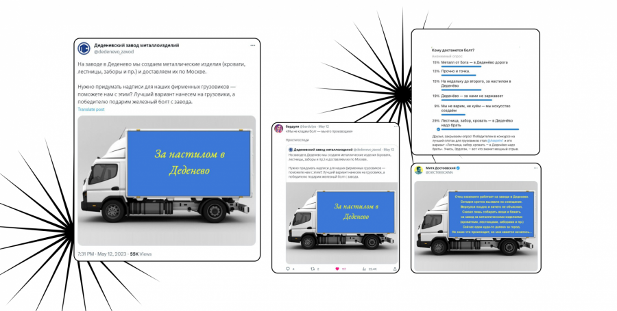 Одним из креативов стало решение привлечь аудиторию социальной сети Twitter (переименован в Х) к разработке запоминающихся баннеров для грузовиков. С аккаунта ДЗМ был опубликован пост с конкурсом на лучший слоган для бортов грузовиков, а победителю пообещали железный болт. Тред поддержали два высокоохватных блогера. В итоге болт достался автору слогана «Лестница, забор, кровать — в Деденёво надо брать», а сам конкурс вышел за рамки Twitter: о нём написали крупные Telegram-каналы.