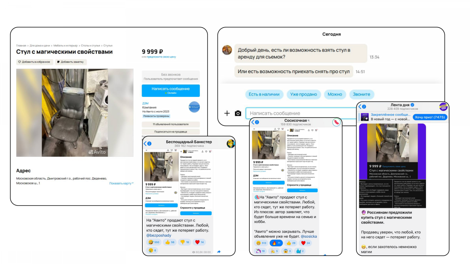 При поиске новых креативов для продвижения ДЗМ выяснилось, что на заводе есть «стул с магическими свойствами»: каждый, кто на него садится — теряет работу. О стуле было решено рассказать на «Авито». В итоге объявление о стуле с мистическими свойствами быстро разлетелось по охватным Telegram-каналам.