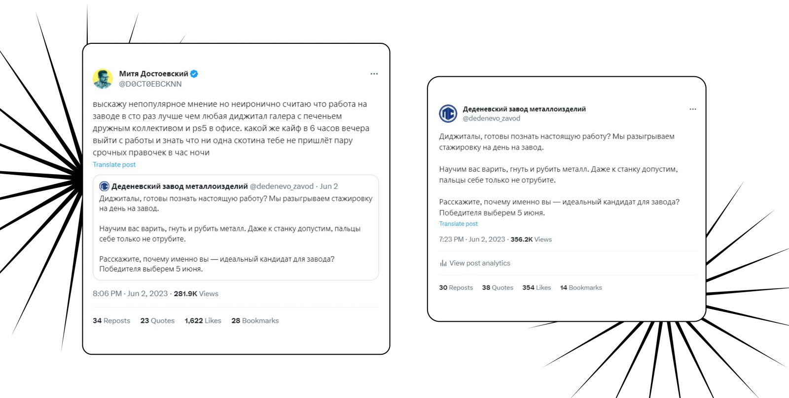 Противоположности притягиваются: так и случилось с суровым заводом и твиттером. В итоге мы получили миллионные охваты с минимальным бюджетом. Пробуйте сочетать несочетаемое, но не забывайте про KPI.