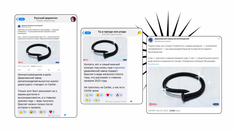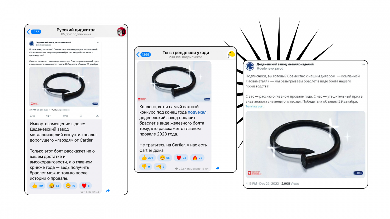 В преддверии Нового года был запущен третий конкурс в Twitter. Участникам нужно было рассказать о главном провале в уходящем году. Автору лучшего фейла полагался железный браслет «Болтье» — наш вариант знаменитого Cartier. Конкурс осветили крупные блогеры и Telegram-каналы, а победителем стал участник, который поделился историей о том, как заблудился в лесу и вернулся домой в плавках.