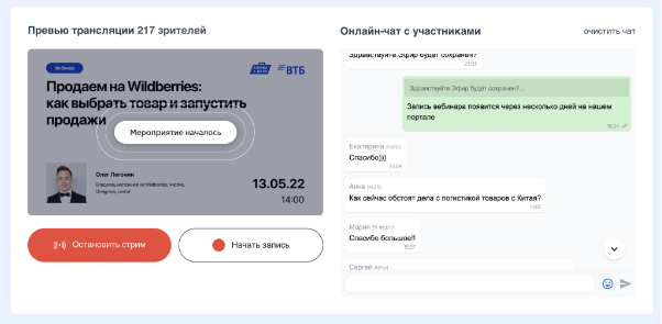 Проводимые на платформе «Ближе к делу» стримы можно ретранслировать в Telegram и «ВКонтакте», а также других площадках нажатием всего одной кнопки. Это помогает увеличивать охват и привлекать новых пользователей.