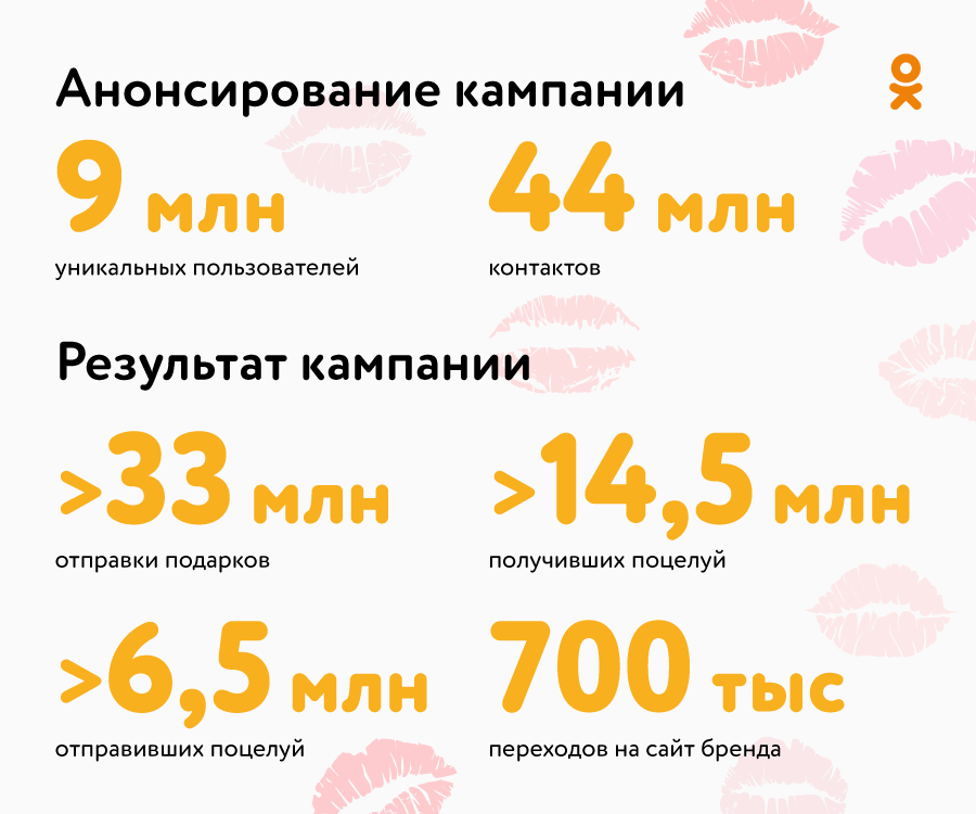 Минимальным KPI для бренда были 150 тысяч переходов на сайт, а также 2 млн уникальных пользователей, посетивших брендированное приложение Faberlic для отправки поцелуев в ОК.