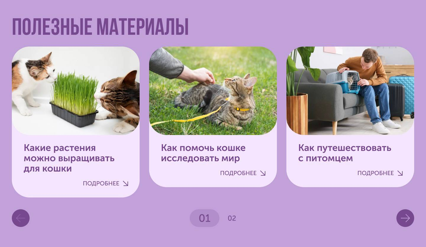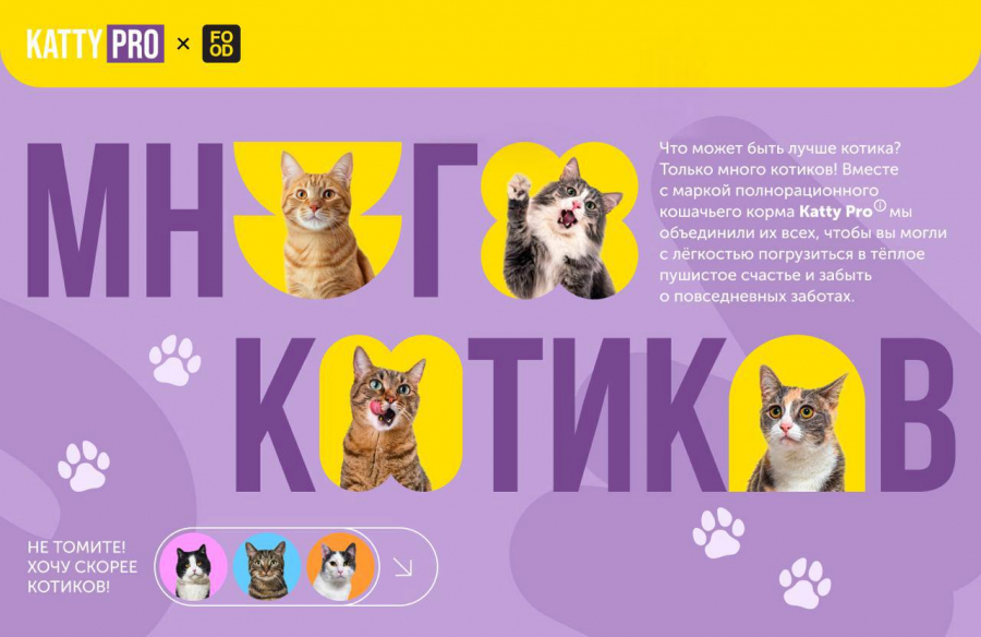 На лендинге также размещались экспертные материалы Food.ru: советы по уходу за животными и рекомендации по питанию с акцентом на преимущества корма Katty PRO. Дополнительно пользователей приглашали познакомиться с подопечными приюта «Муркоша» и, возможно, подарить одному из них дом.